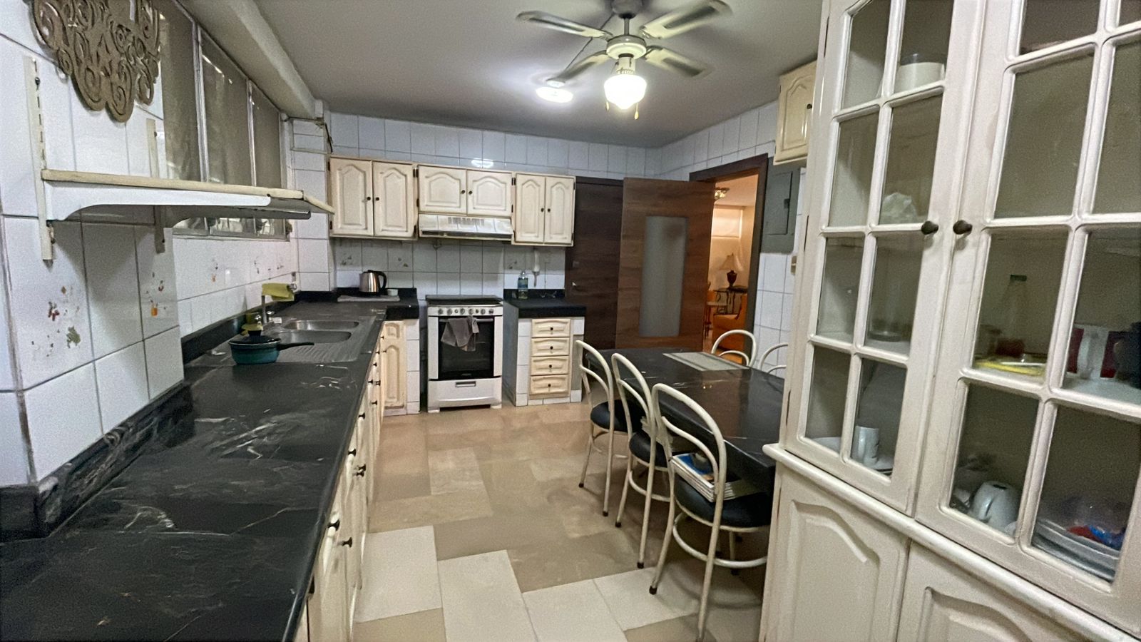 • Cocina cerrada con anaqueles altos y bajos.